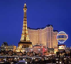 Amenities: Half way up, the Eiffel Tower Restaurant provides the most romantic dining in Las Vegas. And you can watch the Bellagio dancing fountain show right from your table. A two-acre rooftop pool area is located right next to the Eiffel Tower. Has a fully staffed concierge desk. Tennis courts on site. Their Risqui nightclub is very popular. Wedding chapel.